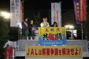 夕方はJAL争議団の全国ネットワークによるJAL本社前での抗議行動に参加し、あいさつ。全国から多数の方の参加に胸が熱くなりました。