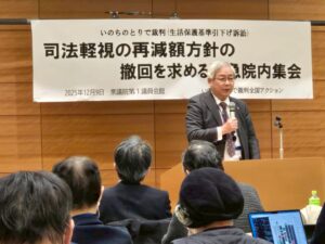 いのちのとりで裁判の原告団のみなさんが再減額方針撤回を求める緊急院内集会。