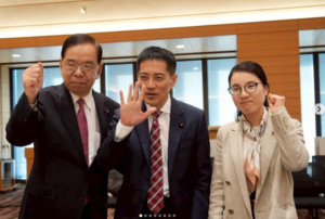 団総会でたつみコータローさんと志位さんとたつみさんの配信に向かってポーズ。志位さんがLIVE配信なのに「いまのやり直し」と言ってやり直すところw